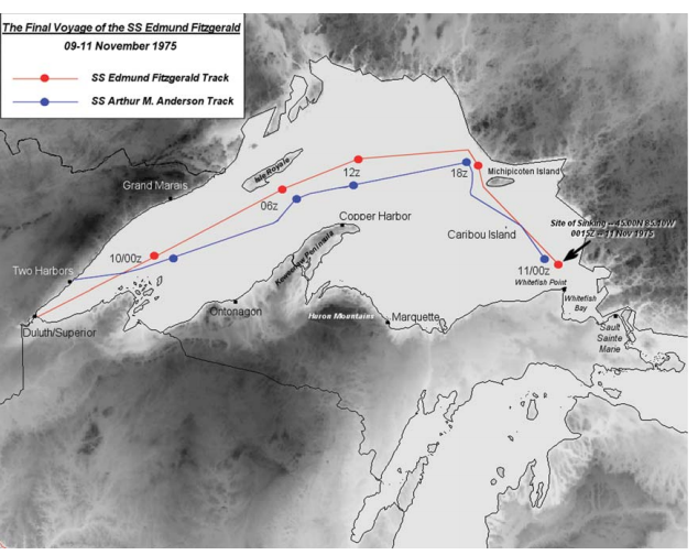 At 1915UTC on the 9th, the Edmund Fitzgerald departed from Superior, WI bound for Detroit. A short time later, the Arthur M. Anderson left Two Harbors, MN and was also headed eastbound. Both masters decided to take a northerly route to keep in the lee of the forecasted northerly gale winds.