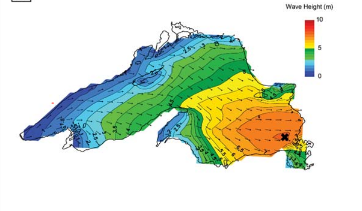 The analysis showed that at 2100 UTC on November 10th there were two cores of high wind over the Lake with one of them in excess of 45 knots and the second in excess of 40 knots. The highest winds occurred over the southeastern part of Lake Superior where the Edmond Fitzgerald was heading. Wave heights increased to near 6 meters and by 0000 UTC November 11th and winds were exceeding 45 knots over most of southeastern Lake Superior.
