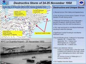 The November 1950 storm caused widespread flooding and wind damage along the East Coast while inland areas were coping with heavy snowfalls and very low temperatures. The storm developed over North Carolina then deepened rapidly into an “East Coast Bomb” as it tracked northward into Pennsylvania before turning northwest and headed towards Lake Erie and later curving southwest and then east across Ohio.