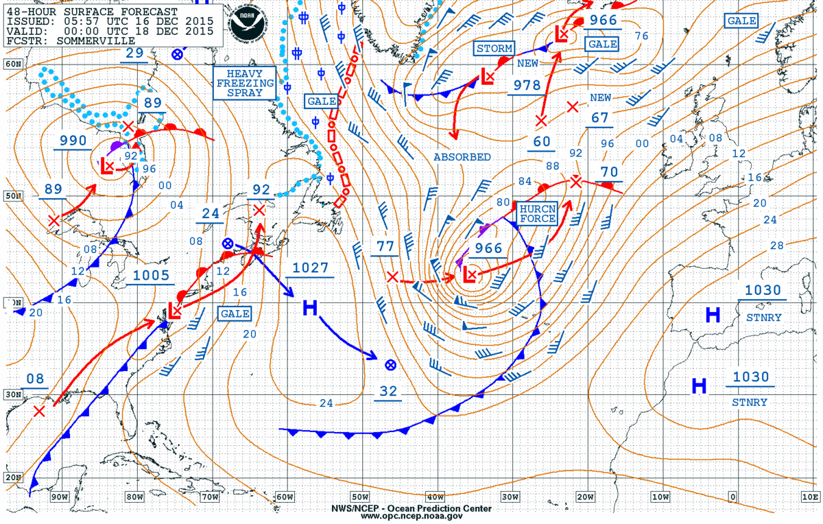 A rapidly deepening low over the western North Atlantic is forecast to produce winds of 50 to 70 knots within 360 NM west of the center during the next 24-48 hours building significant wave heights to over 40 feet (12 meters).