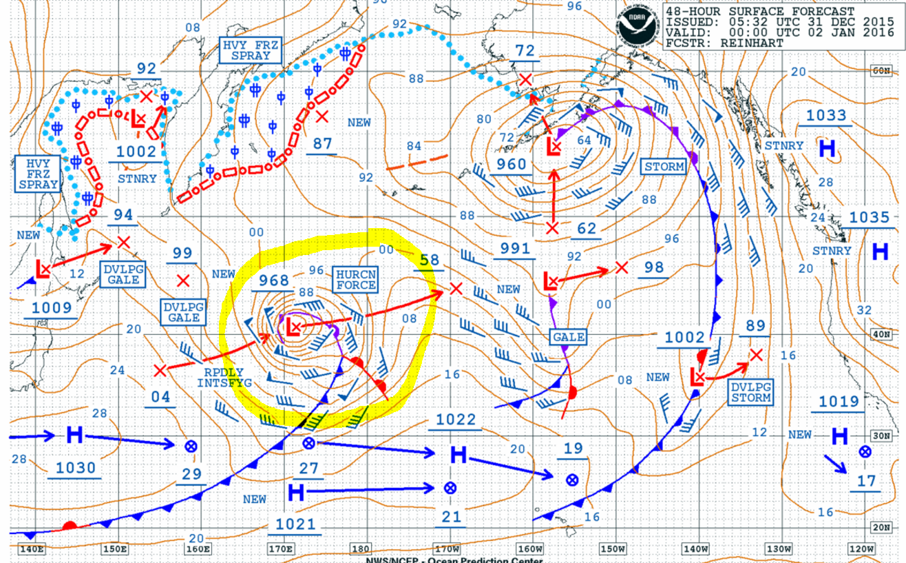 A rapidly deepening storm low is forecast over the west-central North Pacific during the next 72 hours producing winds of 55-70 knots and waves 9-14.5 meters (30-48 feet) within 300NM south and southwest of the center. Max winds and waves are expected along shipping lanes between 35N and 45N latitudes and may cause some shipping delays for westbound traffic.