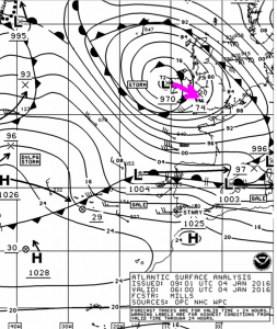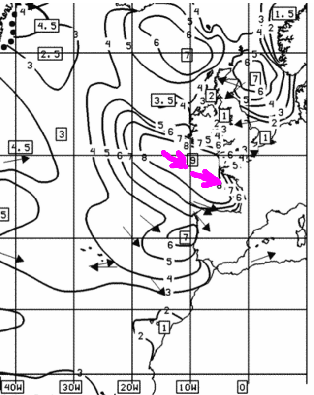 A storm low moving southeastward across Ireland towards southern England is producing gale to storm force winds and significant wave heights of 8-9 meters (26-30 feet) in the approaches to the English Channel and Bay of Biscay today.