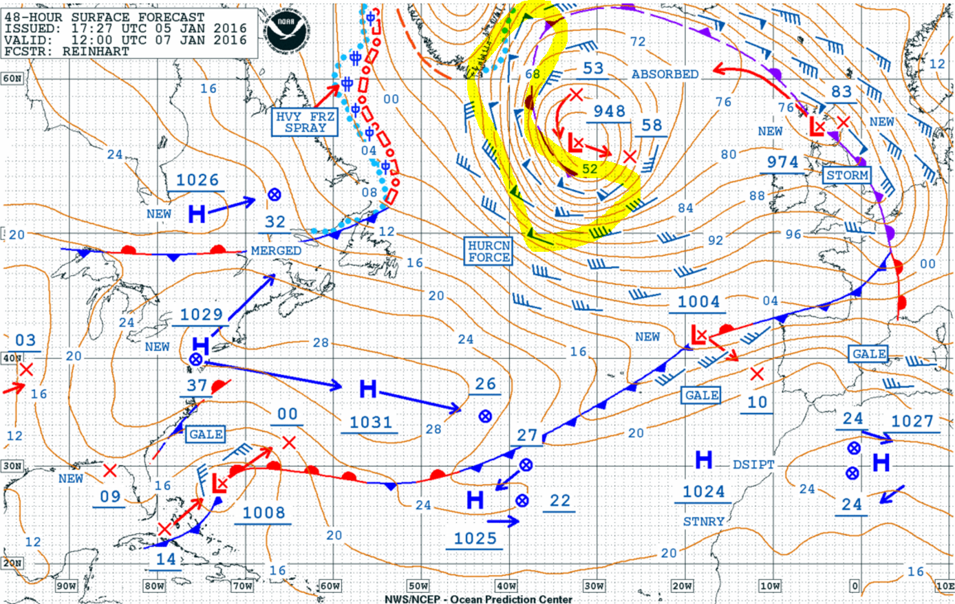 A complex area of low pressure over the Labrador Sea and Northwestern North Atlantic today will consolidate into an intense 948 mb storm low with winds of 50-65 knots and seas to 12 meters (near 40 ft) south and west of the low center by 12Z on the 7th.