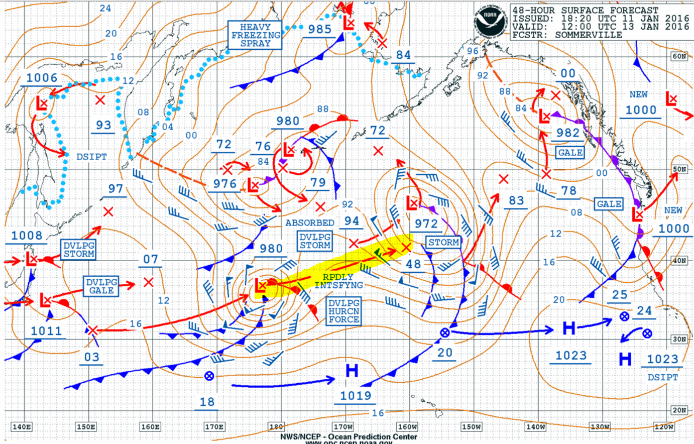 NOAA OPC Wind and Wave forecast for 12Z 14 Jan 2016 shows a large area of Storm force winds (outlined in yellow) with a very large area of hurricane force winds (Fuschia. Winds forecast to 90 knots with seas to 16 meters!
