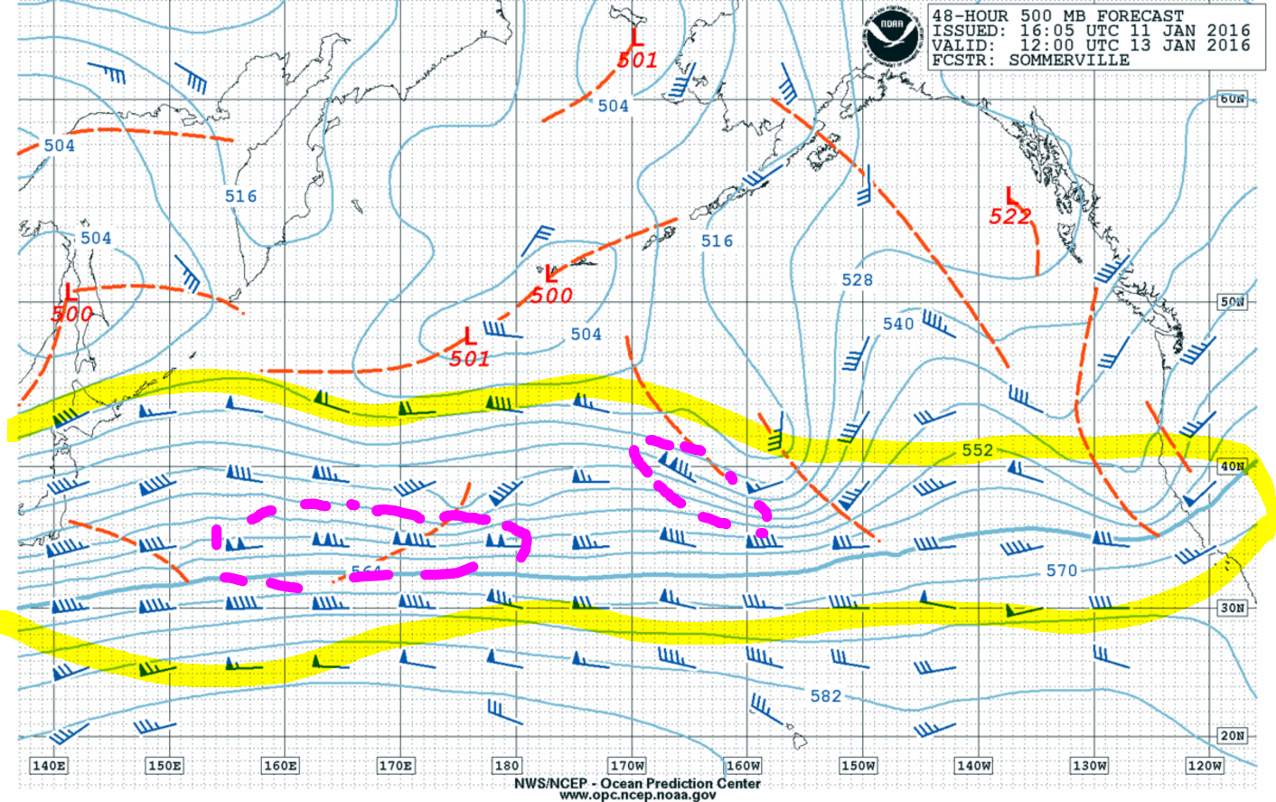 A strong 500MB jet lies west to east across the North Pacific south of 40N latitude and will cause a hurricane force storm to develop over the central North Pacific shipping lanes over the next 2-3 days. Wave heights could build to 15 meters (almost 50 feet)!