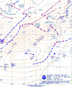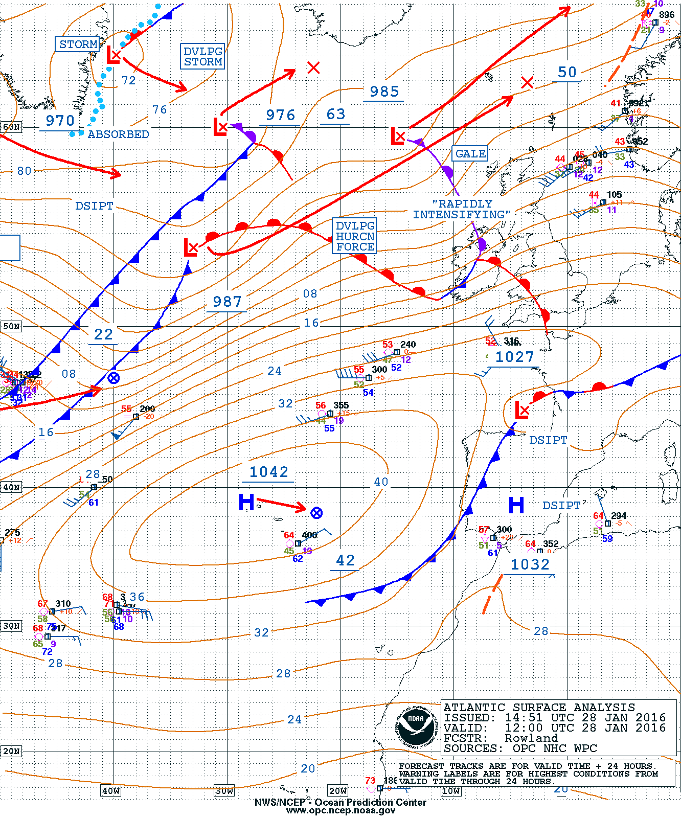 A rapidly deepening low over the northeastern North Atlantic is moving northeast at about 45 knots and is forecast to deepen to 950 mb over the Norwegian Sea during the next 24 hours producing storm to hurricane force winds.