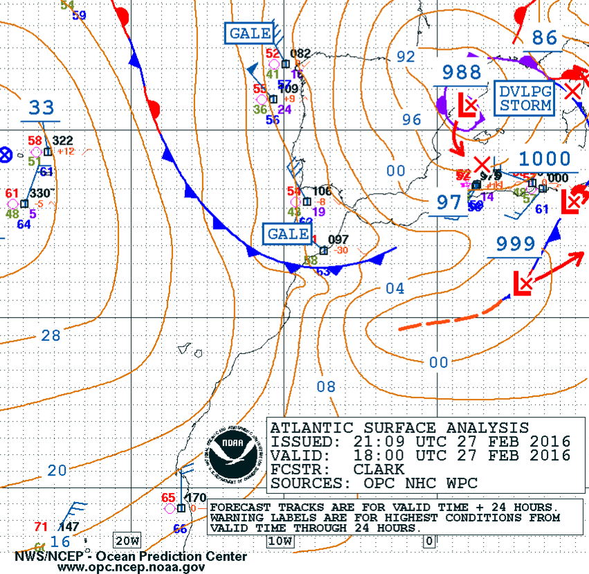 NOAA OPC Surface Analyis 18 UTC 27 February 2016