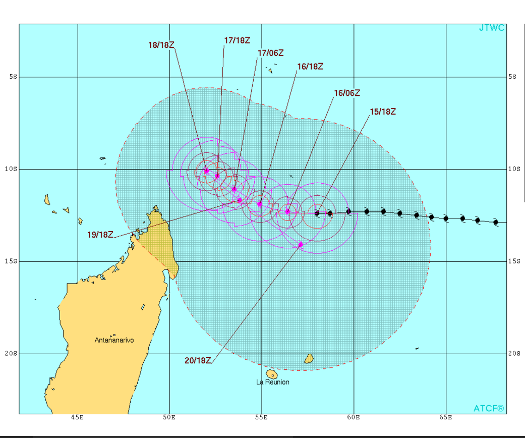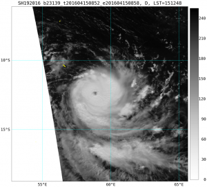 Tropical Cyclone Fantala, located about 464NM north of Port Louis, Mauritius at 2100UTC 15 April was moving west at about 7 knots with max winds of 130 knots. Fantala should be near it’s max intensity during the next 12 hours, then start to gradually weaken as it turns more towards the WNW.