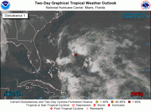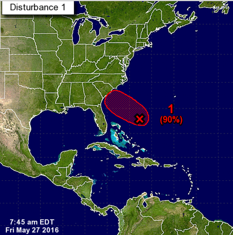 A developing disturbance located between Bermuda and the Bahamas continues to organize.  Conditions favor farther development and there is high (90%) probability that a tropical or sub-tropical cyclone will form later today or Saturday as it moves towards the WNW.  Currently winds are estimated to be 20-30 knots with seas 8-11 feet within 180NM northeast of the center.