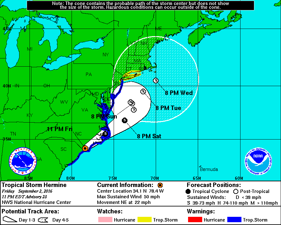 TS Hermine is forecast to move off the coast of NC early Saturday and move slowly over some very warm ocean waters allowing the storm in intensify back to hurricane strength off the coast of Delaware by Monday afternoon or evening.