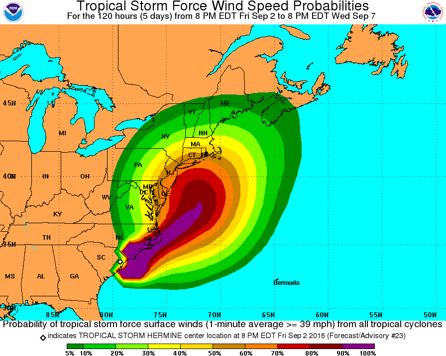 Thereafter Hermine will transition into an extra-tropical low and start to move off towards the northeast. The various models show a large amount of uncertainty in track and intensity forecasts which could have a significant effect on the forecasts for cities from DC to Boston.