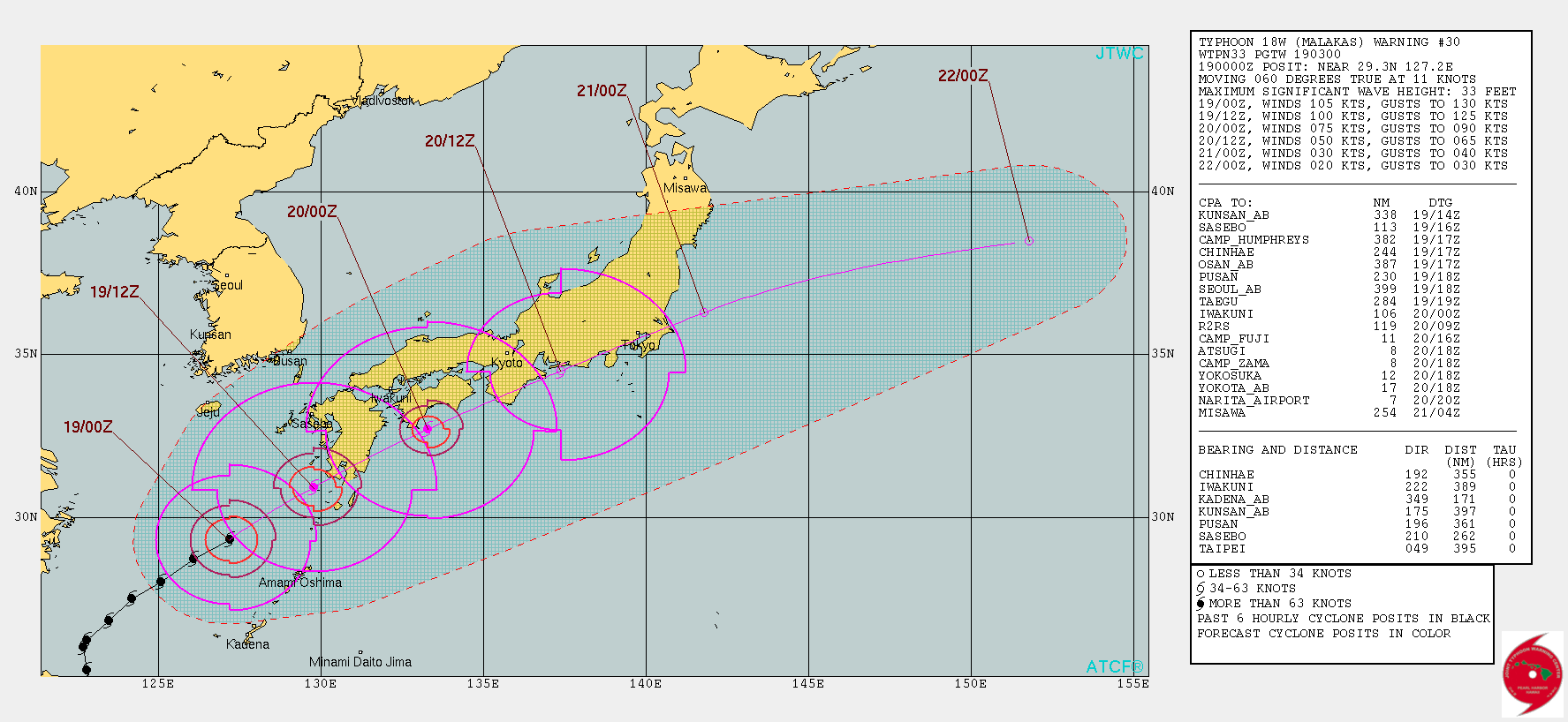 Malakas is forecast to make landfall over Kyushu, Japan about 1400 UTC on the 19th with max winds of about 90-100 knots. Malakas will move along the coast of Japan weakening to a tropical storm prior to passing over or near Tokyo Bay about 1800UTC on the 20th.