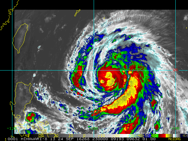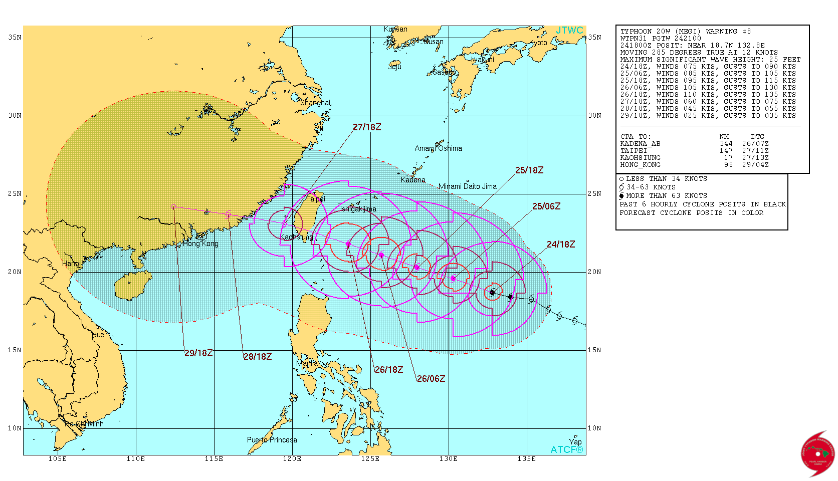 Typhoon Megi over the western North Pacific at 2100 UTC 24 September 2016 was about 544 NM SSE of Kadena, Okinawa and was moving WNW at about 12 knots with max winds 75 knots and max significant wave height of about 25 feet (7.6 meters). Hurricane force winds extend outward about 30-40 NM and 50 knot winds extend outward 60 NM to the southwest and up to 120 NM to the northeast.