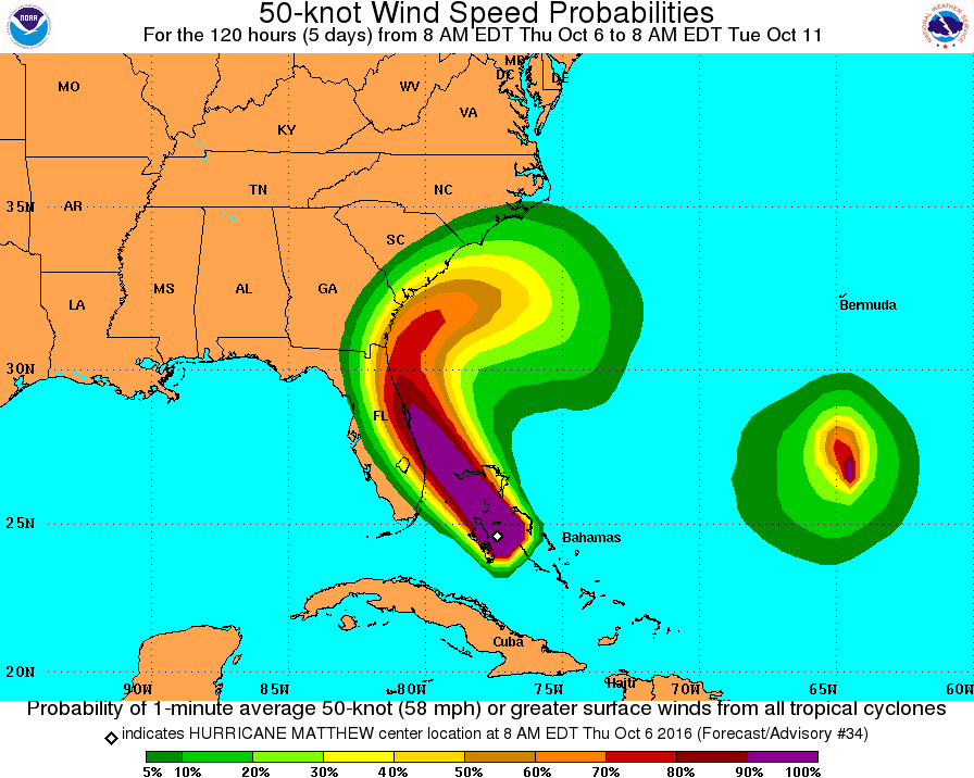 NHC Risk for damaging 50 knot (58mph) or higher wind speeds