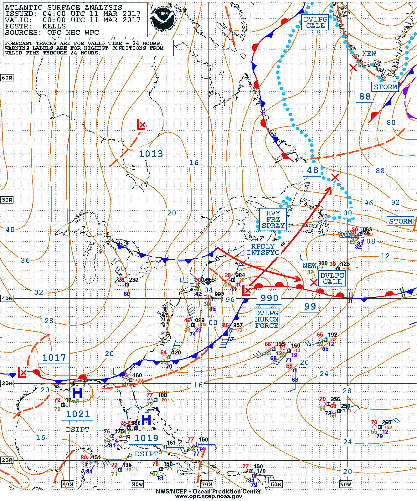The low pressure disturbance that moved off the Middle Atlantic Coast Friday is deepening rapidly and forecast within 24 hours to deepen to 948 mb hurricane force storm low producing winds of 50-70 knots within 240 NM south and east of the center.