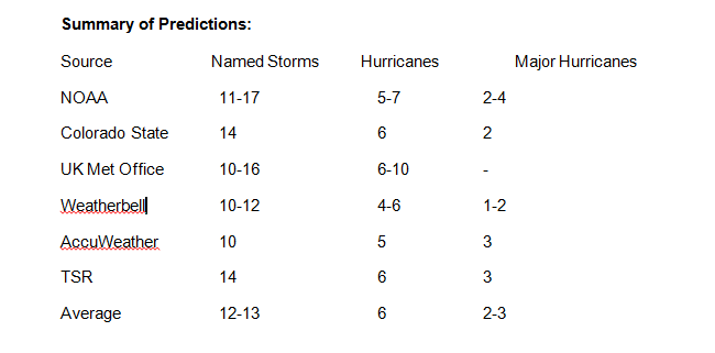 A number of forecast centers have already made their predictions for the 2017 hurricane season with most sources predicting either a normal to somewhat above normal season. There is, however, quite a range in the total number of expected named storms, ranging from as low as 10 to as much as 17. The most likely number being 12-13 storms. For hurricanes, the range is from 6-10 with the most likely number being about 6 hurricanes. For major hurricanes, estimates range between 1 and 4, the most likely number being 2 or 3.