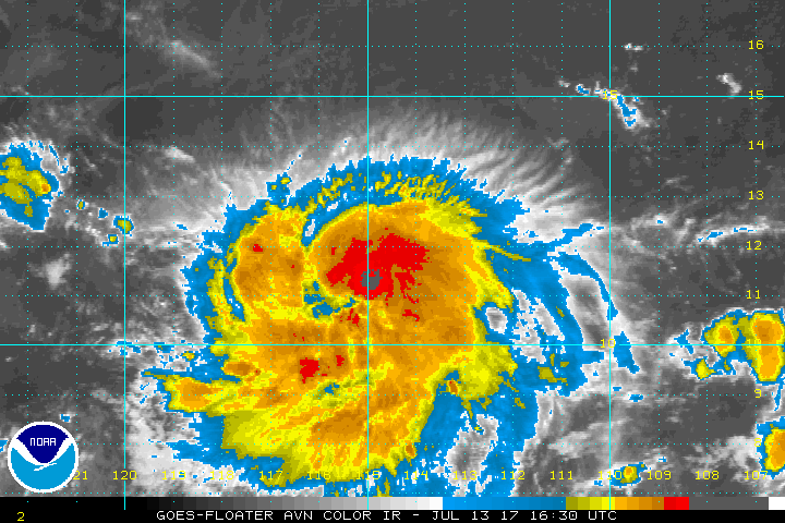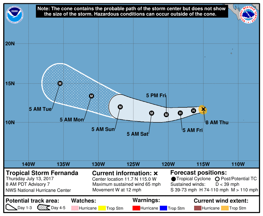 Tropical Storm Fernanda over the eastern North Pacific is moving over warm sea surface temperatures and is expected to deepen rapidly reaching hurricane strength in 6-12 hours with max winds of 100 knots or more in 36-48 hours.