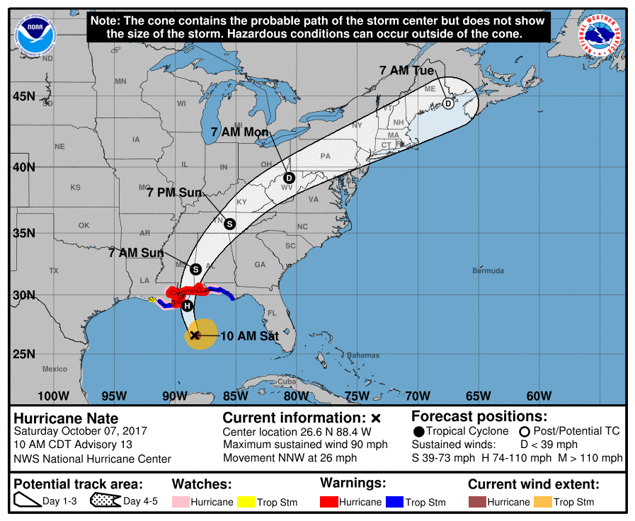 Nate is expected to bring life-threatening storm surge flooding near and well east of where the center makes landfall, and a storm surge warning is in effect from Morgan City, Louisiana, to the Okaloosa/Walton county line in Florida. Maximum flooding of 7 to 11 feet above ground level is expected in portions of southeastern Louisiana and along the Mississippi coast. Residents in these areas