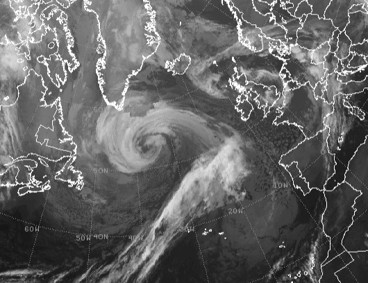An intense 947mb hurricane force storm low over North Atlantic well east of Newfoundland is moving northeast at 15 knots. Currently winds of 65-85 knots extend outward 120 NM south of the center with seas to 40 feet (about 12 meters). Also, within 180 NM northwest of the center winds are 50-65 knots with seas to 32 feet (about 10 meters).