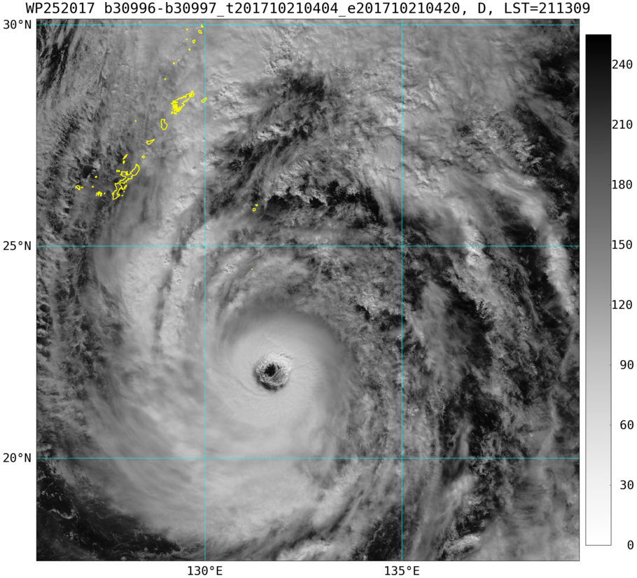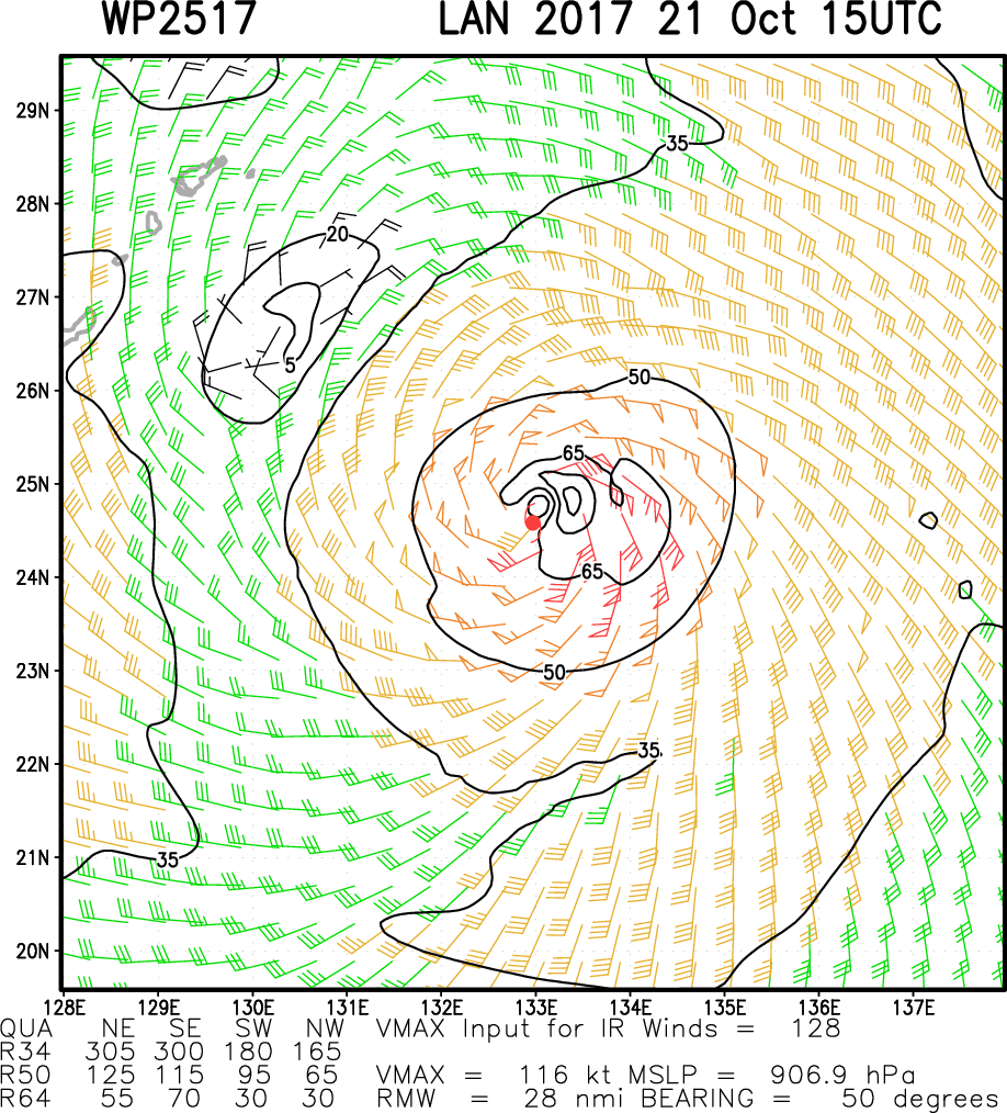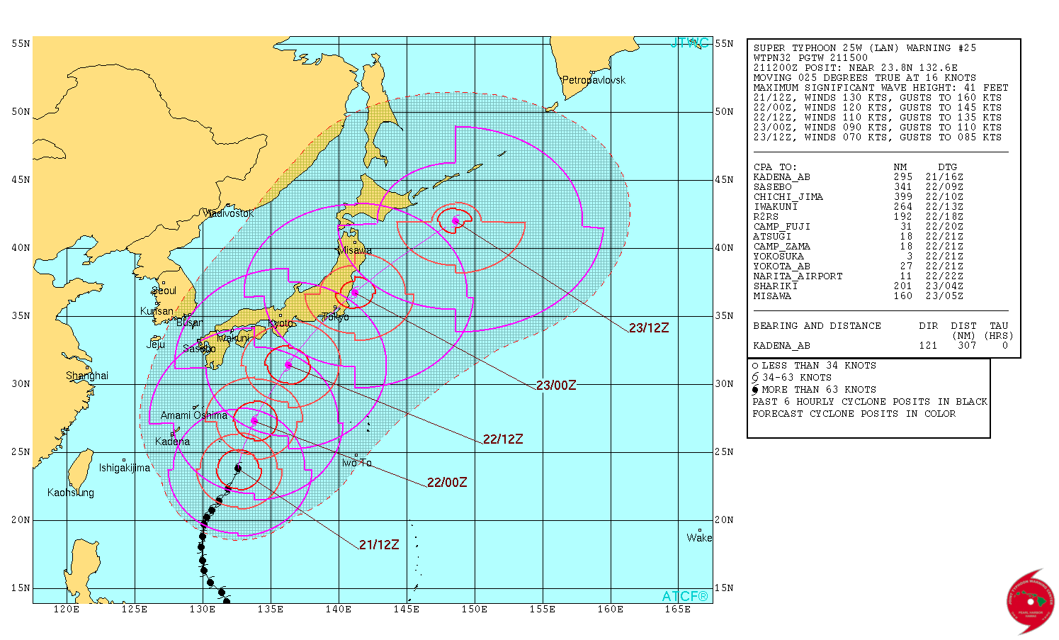 Super Typhoon Lan at 1200 UTC 21 October was center about 307 NM east-southeast of Kadena Air Force Base on Okinawa, Japan and was moving N-NE at 16 knots with max winds up to 130 knots. Lan has a large 45 NM wide eye and hurricane force winds currently extend outward up to 95 NM while 50 knot or higher winds extend outward up to 180 NM.
