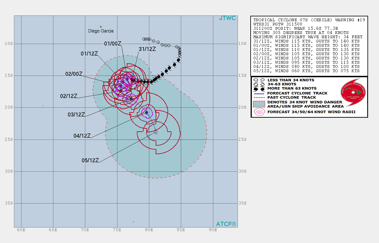 Tropical Cyclone Cebile located about 583 NM S-SE of Diego Garcia in the southern Indian Ocean is packing winds to 115 knots with max significant wave heights to 34 feet (10.4 meters). Hurricane force winds extend outward 50 NM to the southeast and 35 NM to the north. Cebile is moving slowly towards the west-northwest at 4 knots.