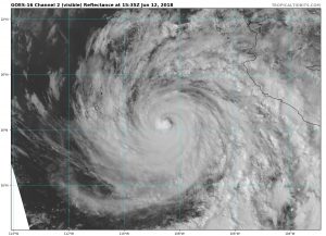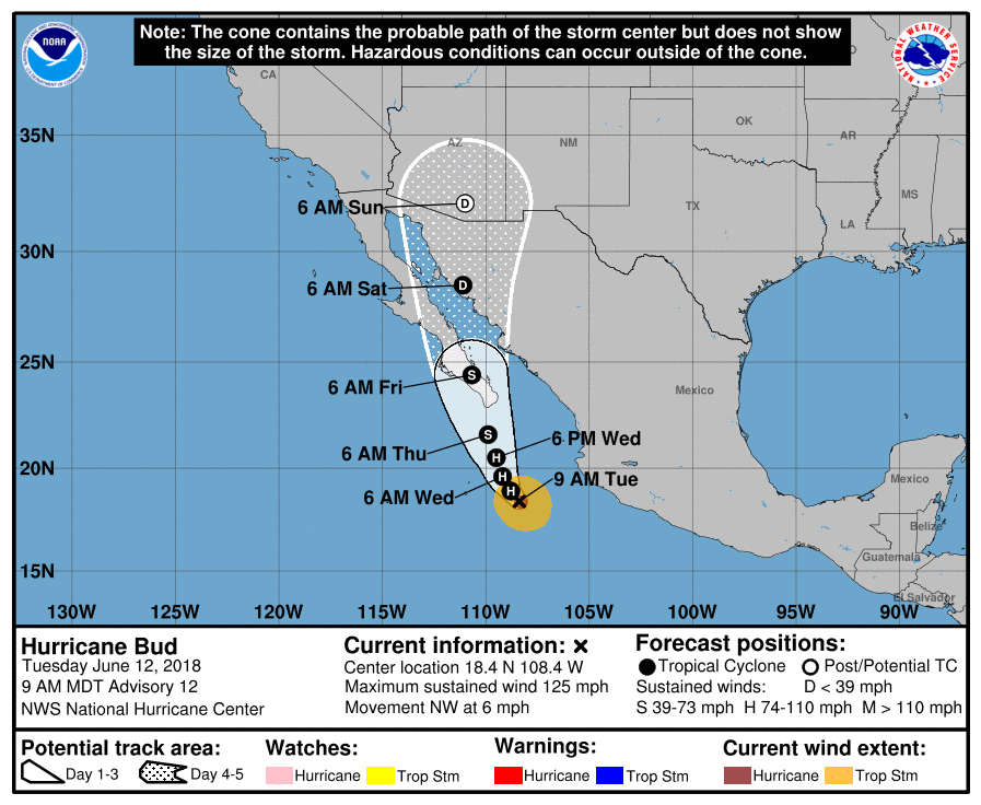 Hurricane Bud reached peak intensity around 0600 UTC with a max wind of about 110 knots as it moved towards the northwest at about 5 knots. Hurricane Bud is forecast move in a north-northwestward direction for the next 36 hours then turn more towards the north.  Bud will be moving over cooler water and will gradually weaken and move across Baja California Sur as a tropical storm on Thursday.