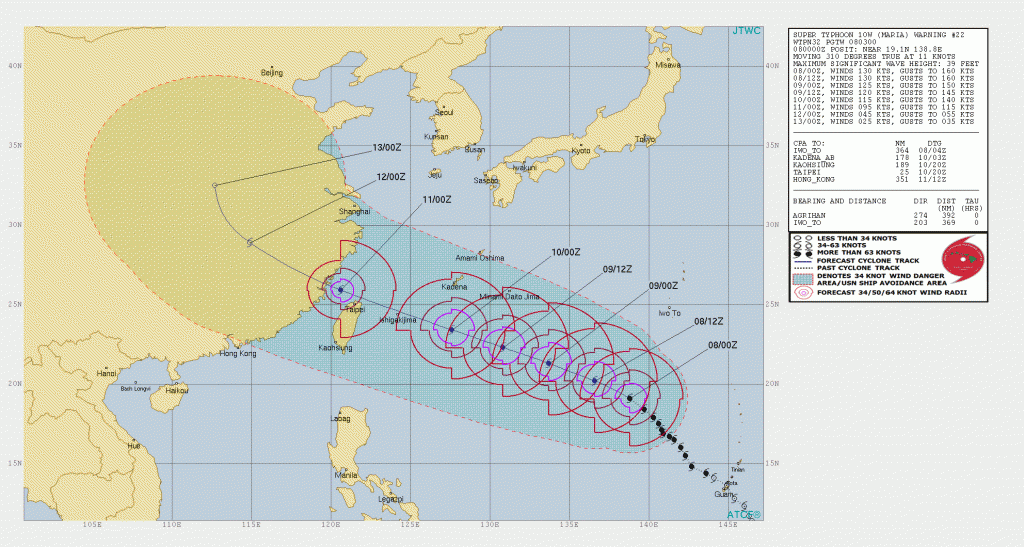Super Typhoon Maria over the western North Pacific was centered about 369nm S-SW of Iwo To and was moving towards the northwest at 11 knots.  Max winds have reached 130 knots with hurricane force winds extending outward  35-55 nm while 50 knot or higher winds extend outward 70-100 nm.