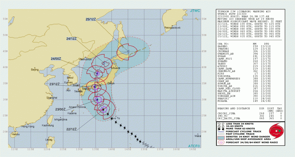 Cimaron has already reached its peak intensity and is forecast to gradually weaken making landfall over eastern Shikoku at about 12:00 UTC on the 23rd with max winds near 80 knots, then move northward across Honshu into the Sea of Japan.