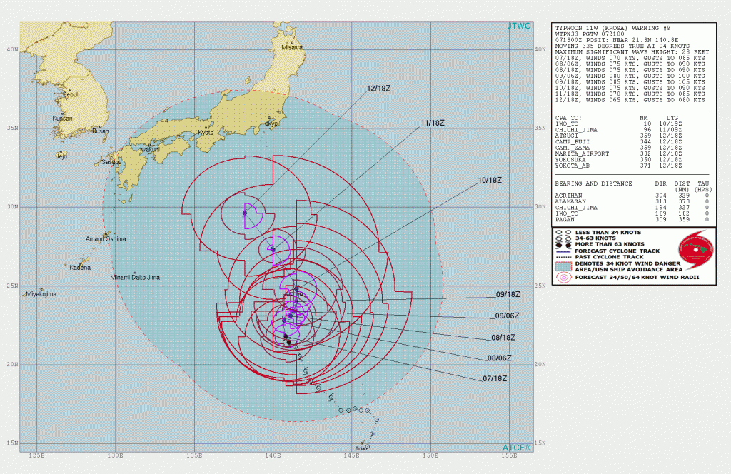 Typhoon Krosa, located about 182 nm south of Iwo To was moving NNW at 4 knots with max winds to 70 knots and significant wave heights to 28 feet. Krosa is also under favorable conditions and could reach max winds of 80-90 knots over the next 48 hours.