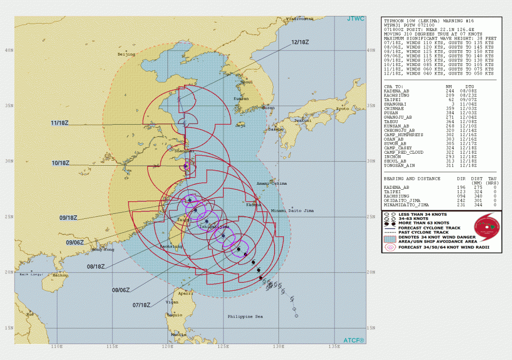 Typhoon Lekima, located about 275 nm SSW of Kaldena AB was moving NW at 7 knots with max winds to 110 knots and significant wave heights to 39 feet. Conditions favor some additional strengthening and Lekima could reach max winds of 120-130 knots over the 24 hours as it passes north of Taiwan.