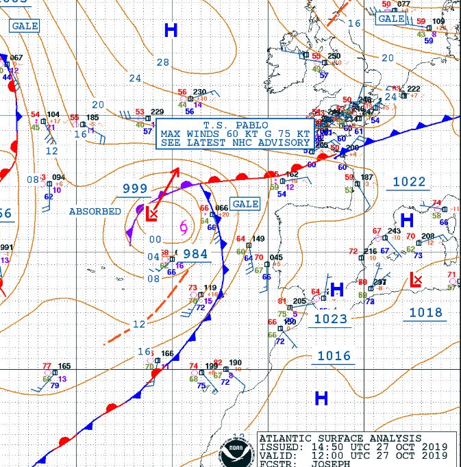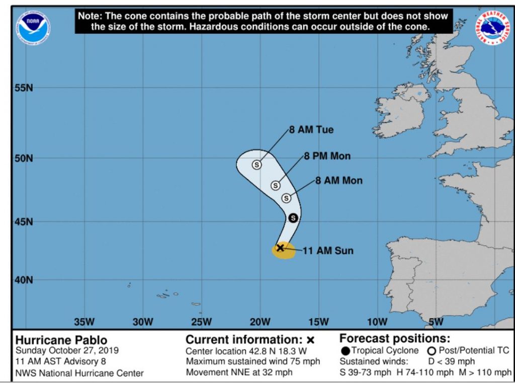 Pablo is now a hurricane over the eastern North Atlantic with max winds of 65 knots even though it is moving over relatively cool ocean waters. Pablo is moving N-NE at 28 knots over even colder ocean water so it should weaken and then merge with a nearby frontal system becoming extratropical over the next 12-24 hours and eventually being absorbed into the larger low pressure system to the west over the next 48-72 hours.