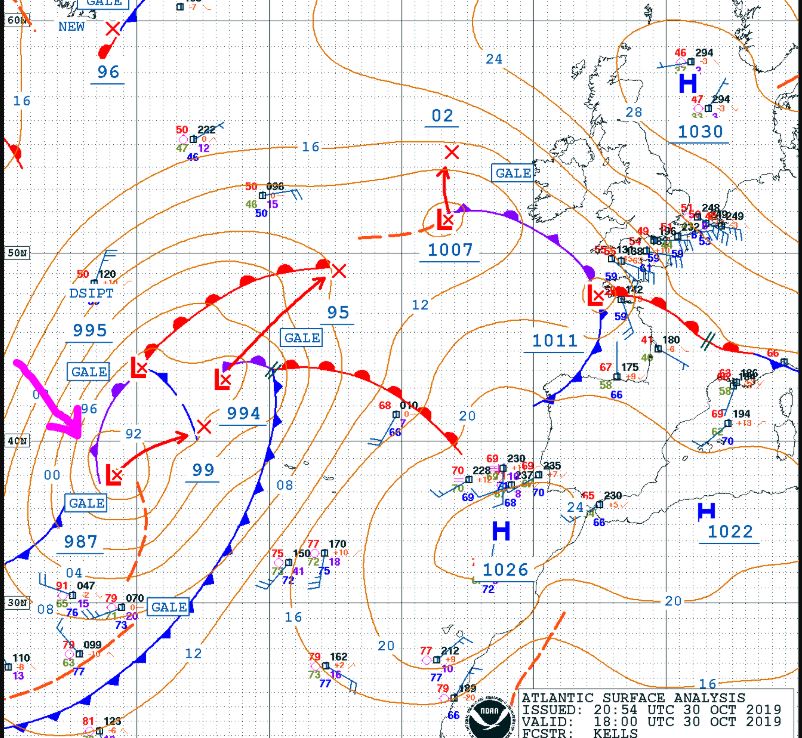 Update: The disturbance within the larger North Atlantic gale low has been designated as a subtropical cyclone by the NHC with an initial intensity of 40 knots. Like Pablo just a few days ago, Rebekah is currently rotating around a larger non-tropical low pressure system