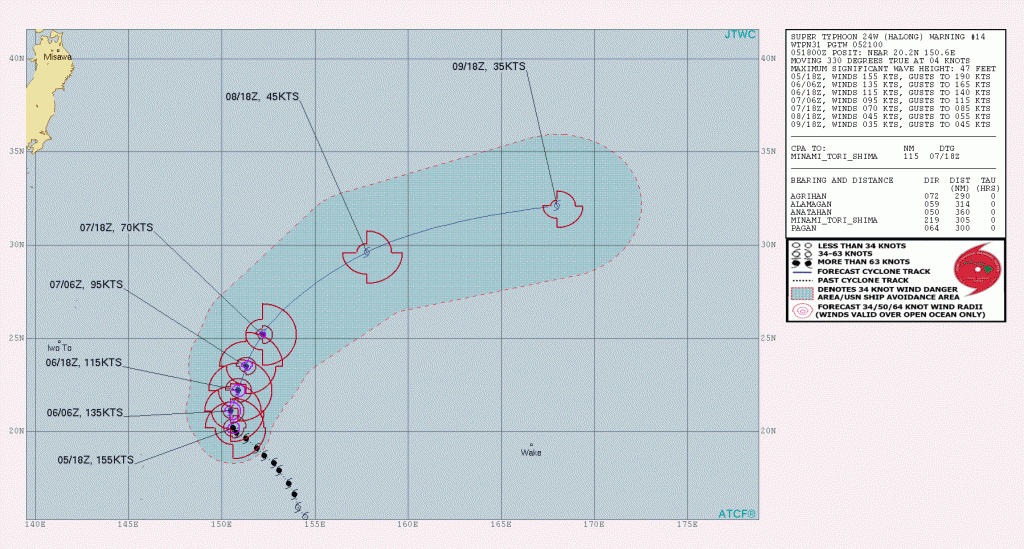 Halong is a very dangerous storm but very small in size. Currently hurricane force winds extend outward only 15-20 nm with 50 knot winds outward 30-35 nm. The max significant wave height is estimated to be 47 feet (14.3 meters).