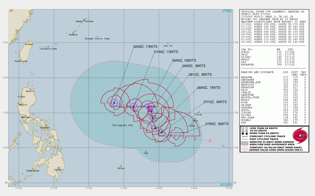 Max winds currently at 55 knots is forecast to intensify to typhoon strength shortly and to over 100 knots in about 72 hours. Kummuri is expected to turn NW or NNW within 24 hours. After about 72 hours, Kummuri is forecast to turn back to a westerly track.