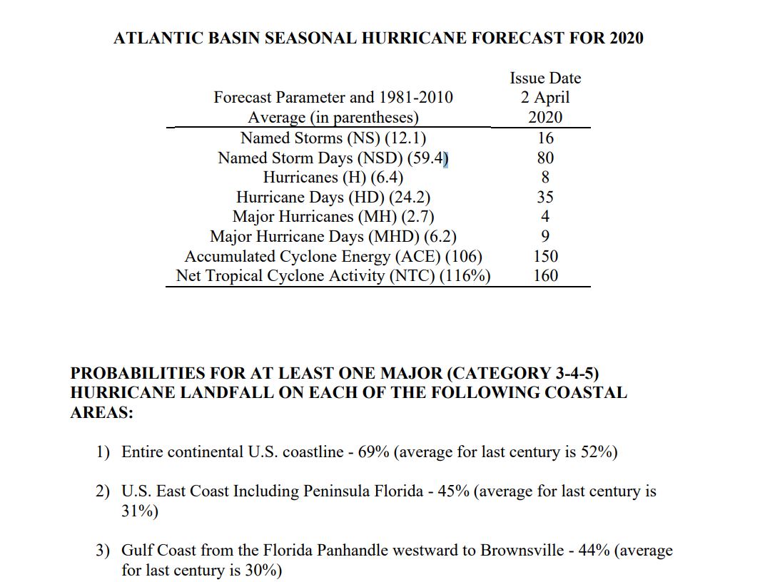 As a result, an above-average probability for major hurricanes making landfall along the continental United States coastline and in the Caribbean is anticipated. Read full report https://tropical.colostate.edu/media/sites/111/2020/04/2020-04.pdf