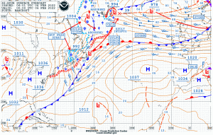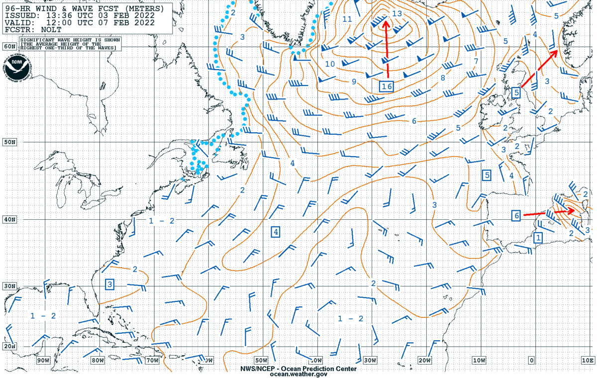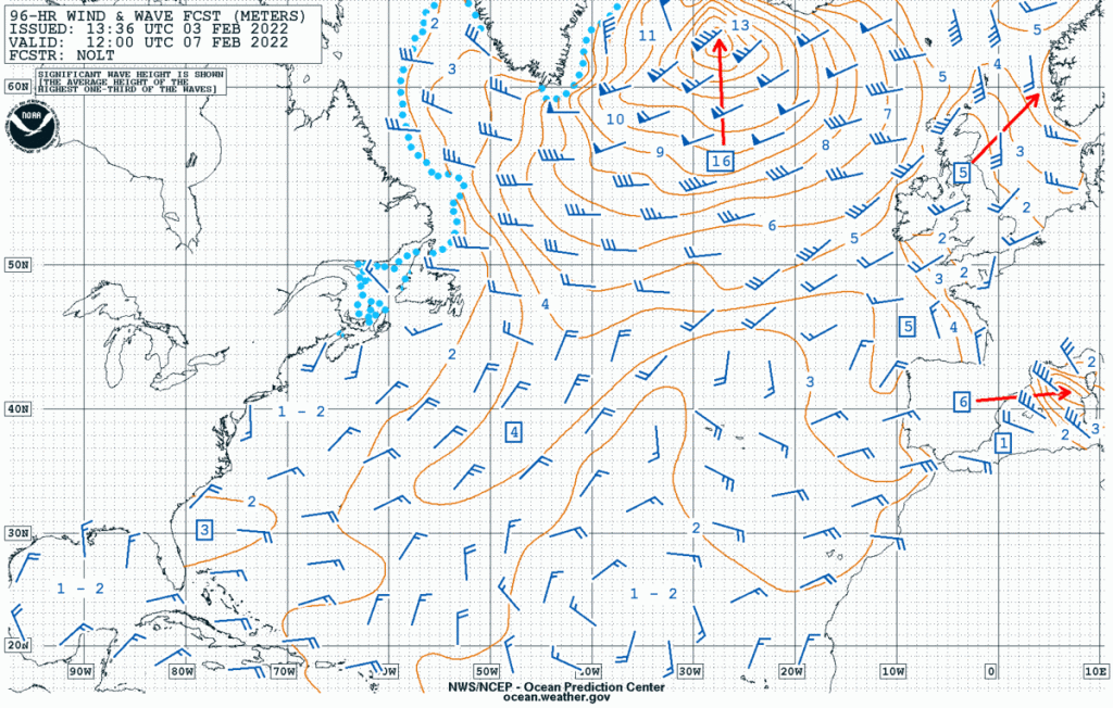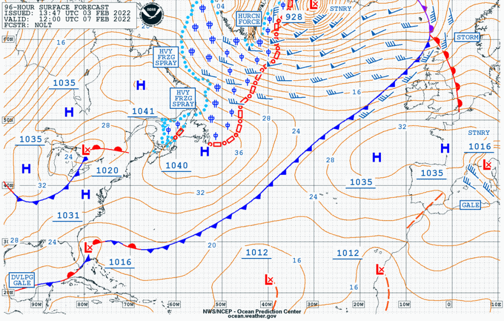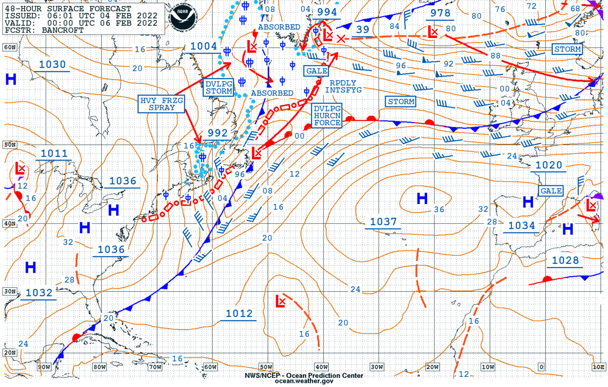 A rapidly developing 992 mb storm low is expected just off the coast of Newfoundland by 00UTC/6th and is forecast to move northeastward deepening to a 928 mb hurricane-force storm to the west-south west of Iceland by 12UTC/7th.