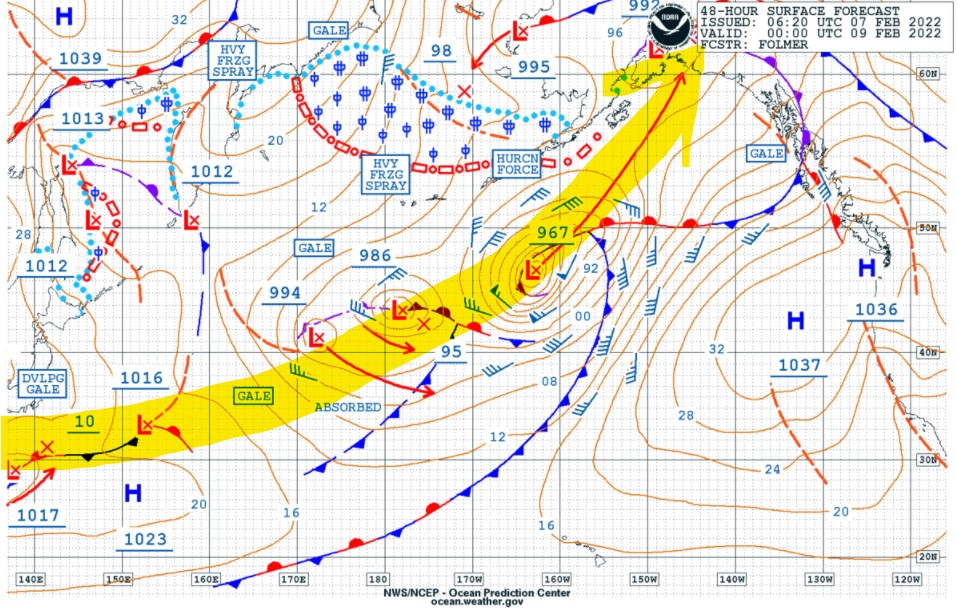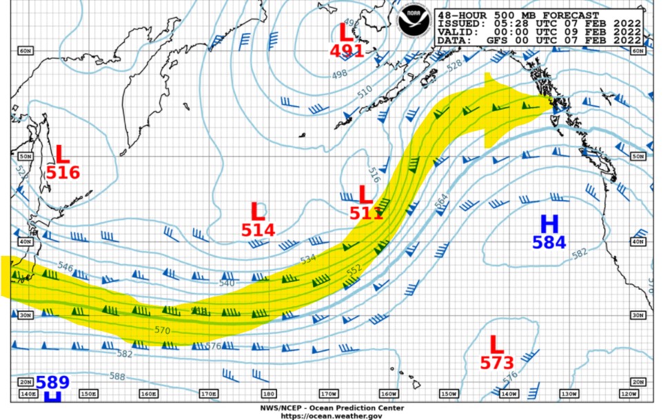 The primary jet stream continues to be displaced south of 40 N latitude over the western and central North Pacific then turns northeastward towards the Gulf of Alaska due to a persistent blocking ridge over the easternmost North Pacific.
